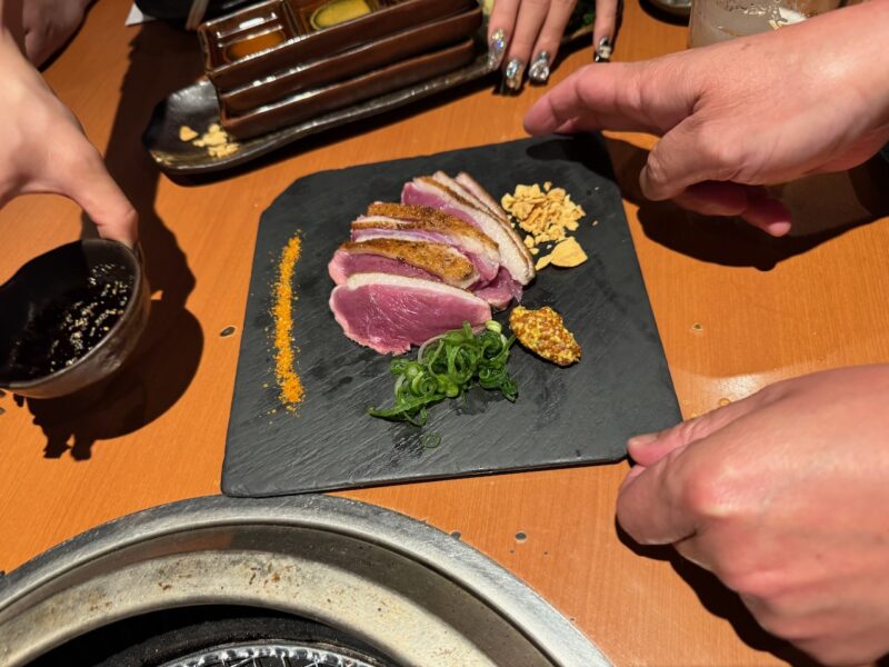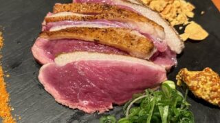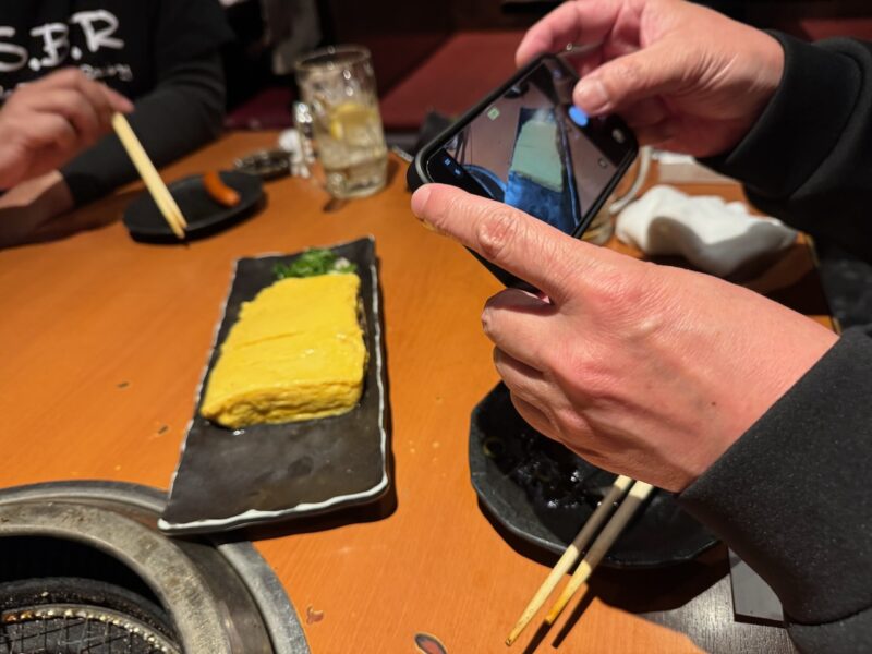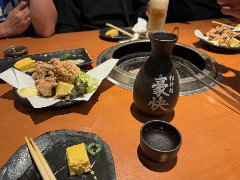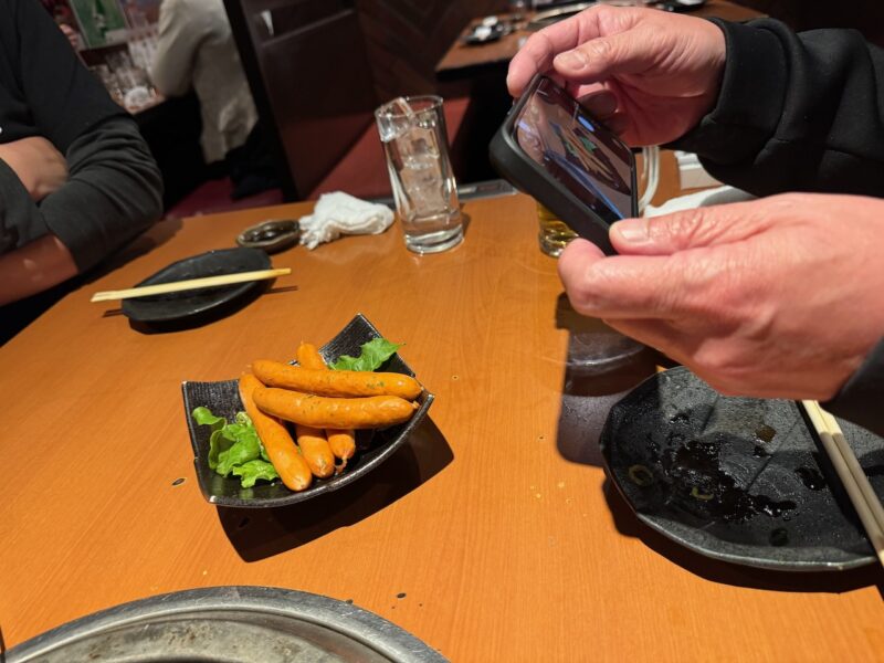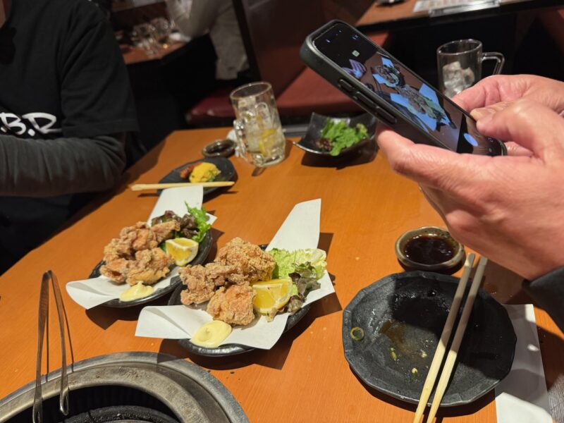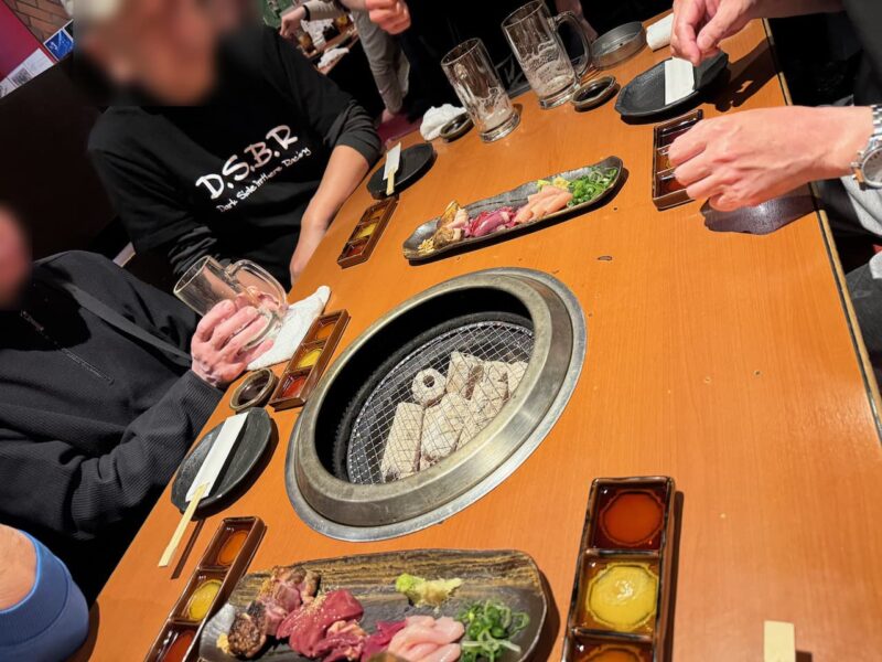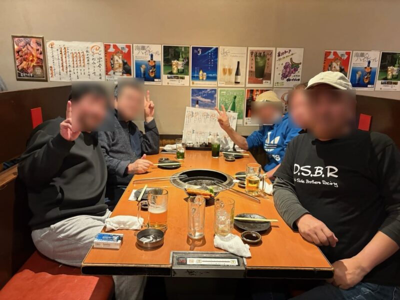 テーブルは、換気扇付きの練炭?炭火焼きです。先ずは、生ビールで乾杯です。そして、記念写真を撮って頂きました。kimukenさんが、D.S.B.R のメンバーのユニホームを着て来られてました。そして、地鶏のお造り盛り合わせからスタートしました。鴨のタタキ、そして、軍鶏焼き盛り合わせと地鶏焼き盛り合わせの焼き物頂きました。生ビール2杯を飲んだ後は、抹茶?の酎ハイを頂きました。チョリソー、だし巻き、地鶏の唐揚げは、飲食ブロガーの暗黒さんが料理を撮影する状況を写真に納めました。その後、冷酒の2合を飲んで、自家製レバ塩漬けを頂いて、次にチキン南蛮を頂きました。最後に博多炊き餃子を頂きました。飲み物は、最後にハイボールを飲んで終了しました。飲んで食って、美味しくって、楽しく頂けました。(料理名は暗黒さんのブログを参考にさせて頂きました)