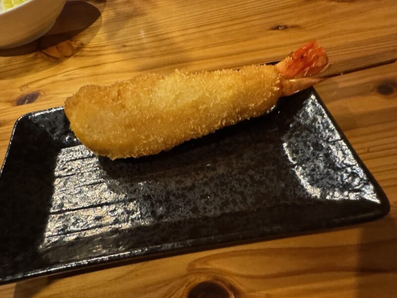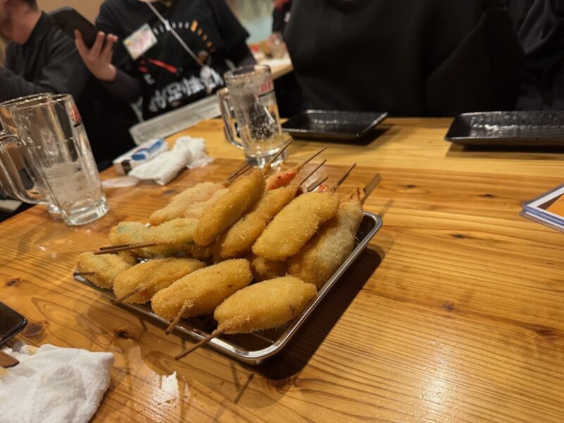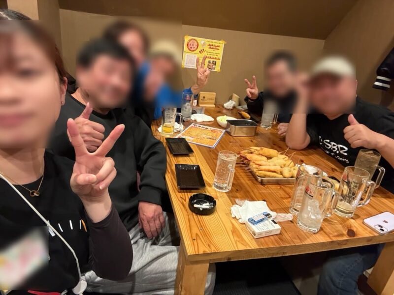 色々とメニューを検討して注文をしました、、、、と思います。記憶が薄くて覚えてません。串かつ屋さんらしく、ソースの2度付け禁止です。飲み物は、酎ハイを2杯程度、頂きました。どうも自分だけ大エビを頼んでいた様です。此処でも記念写真を撮って貰いました。店の女の子もしっかりと入ってました。多分?22時半頃にお開きとなりました。