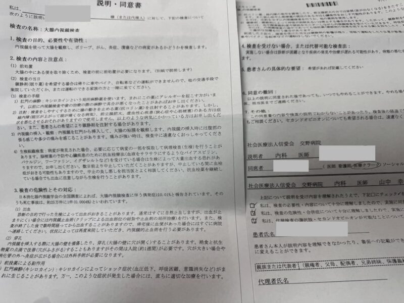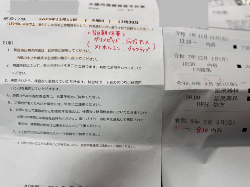 大腸内視鏡検査の説明・同意書にサインした用紙のコピーを貰い、予約書を貰いました。同意書には、しっかりと読むと怖い事が書かれてます。今回、糖尿病の薬を飲まない様にと指示が出ました。検査は、11月11日(火)13時30分からスタートします。詳しい検査結果の説明は、12月1日(月)に行う予定です。