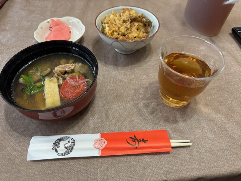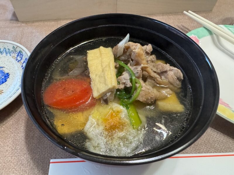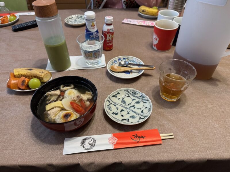 大晦日に食べたひねドリのすき焼の残りを利用した、雑炊と雑煮をいただきました。朝食時は餅は2個でしたが、昼食は、1個です。
