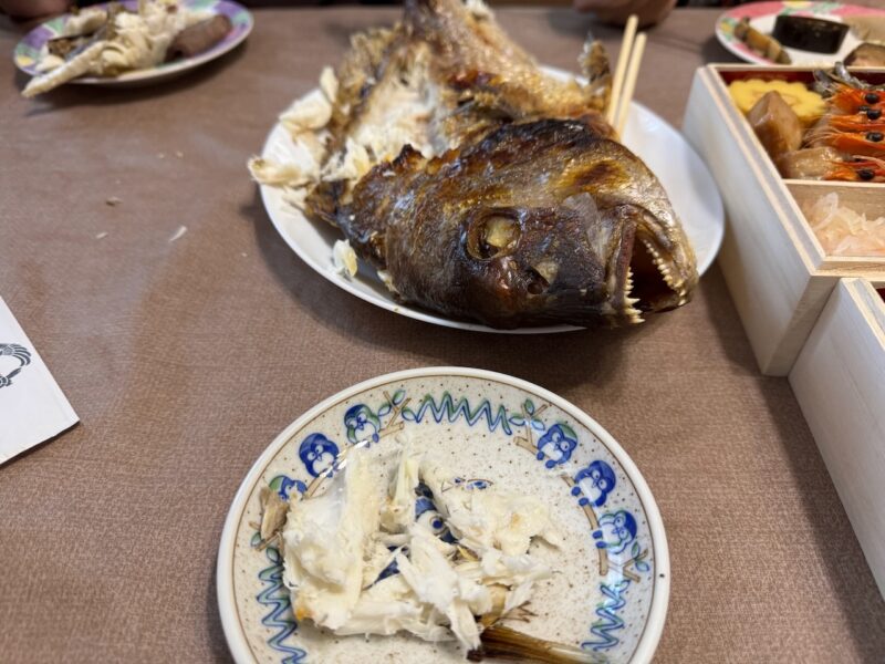 お節料理を食べました。そして、焼き鯛の身のおにぎりです。美味しく頂きました。