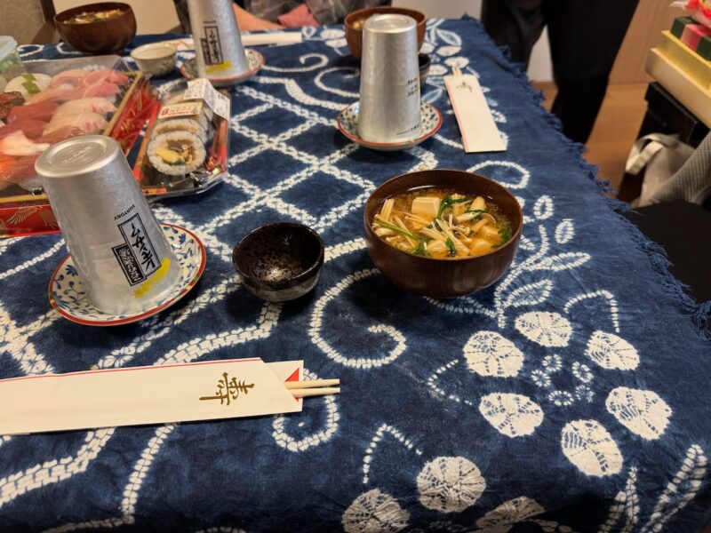 晩飯は、寿司です。赤だしも付きました。翠と日本酒の風の森を頂きました。義弟の家には、色々とお酒が準備されてます。