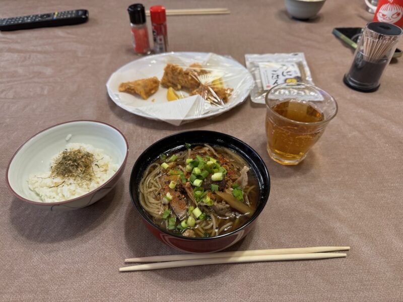 前日の鴨鍋の汁で鴨そばを作って貰いました。そして、少量のご飯にウニのふりかけを振って食べました。