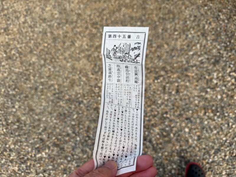 毎年恒例になってる、神(;妻)さんの実家からの初詣です。2026年は、2人で自転車で移動しました。5分程度で到着しました。裏から入って鳥居の横を通って、鳥居の正面を潜って神社に入りました。手水舎の水で清めてから参ります。今年は、出店が4件出てました。後は、いつもの様に本殿から全ての神々へ参ります。途中でおみくじを引きました。「吉」が出ました。まぁまぁ良い運勢では無いでしょうか?池が綺麗に整備されて、鯉が泳いでました。鯉の餌の自動販売機まで有りました。昔、昔、私が中学生の時も綺麗に整備されてましたが・・・。長く、綺麗であって欲しいと思います。最後にベビーカステラをお土産に買って帰りました。神さんとは、途中で逸れて神社では会いませんでした。例年、同じ様な行動を取ってると思います。