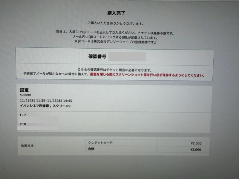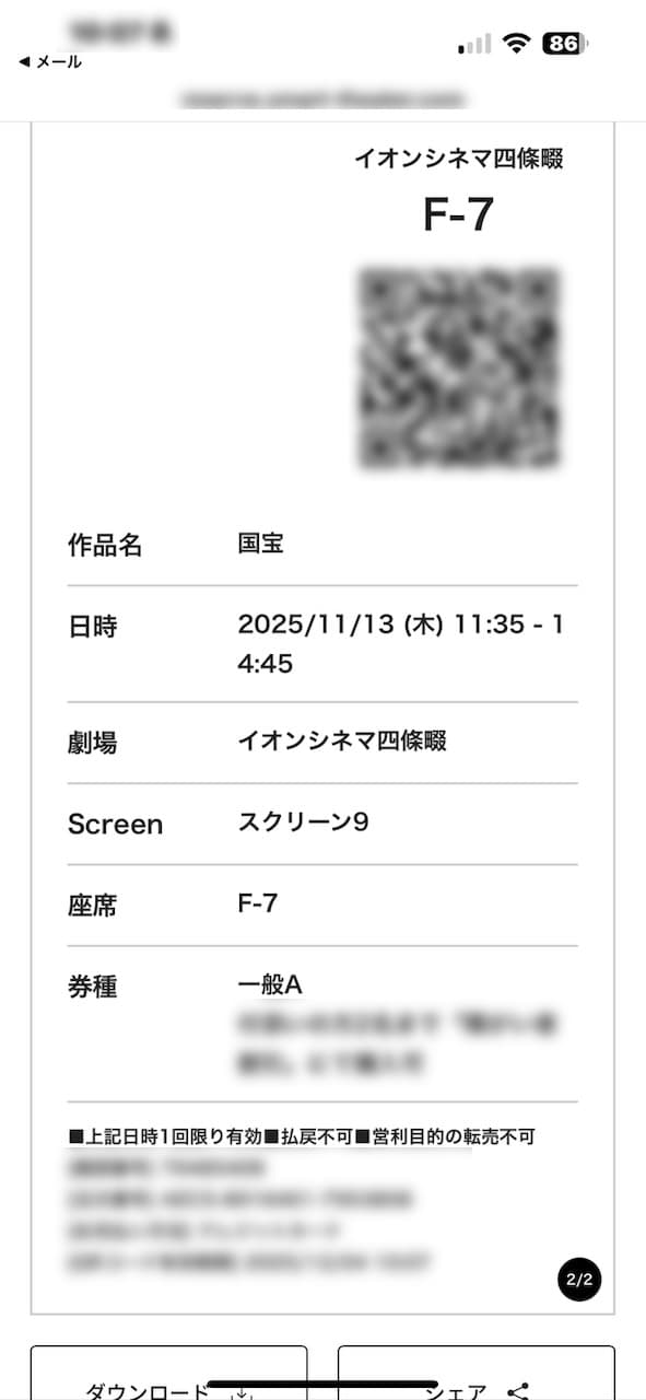 映画は、四條畷イオンシネマで観ました。恐らく、3年振りの映画館だと思います。予約は、WEBで行いました。購入、席指定まで完了出来ました。前回は、確認番号で処理したと思うのですが、今回は、届いたメールを確認するとQRコード付きの指定席の情報が付加されてました。何とこれを入口で見せて、入場します。便利になったモノだと感心しました。