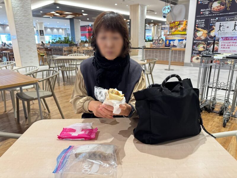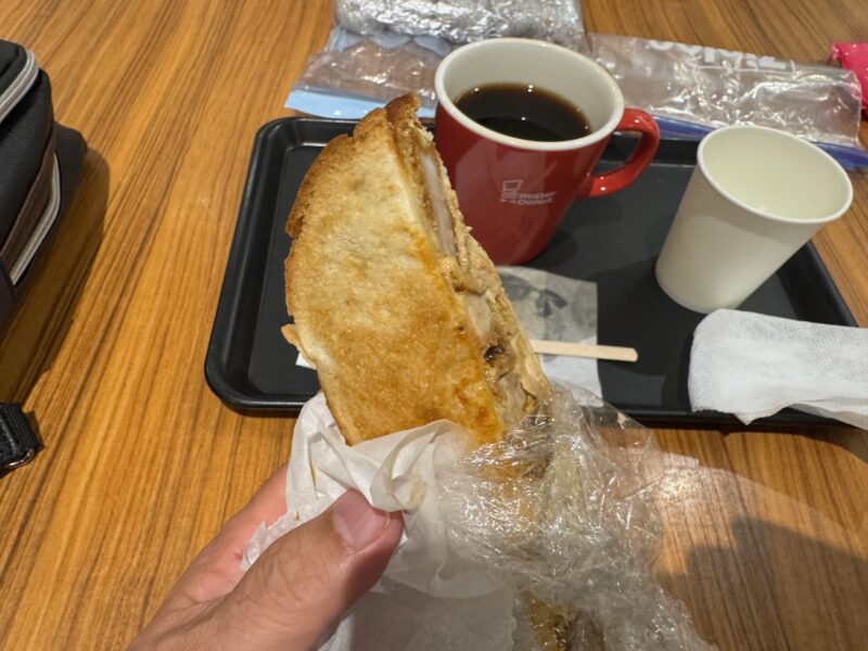 上映終了後にミスタードーナツでコーヒーを買って、大きなフードエリアでカツサンドを食べました。神さんは、うどんと持って来た小さなおにぎりを食べてました。
