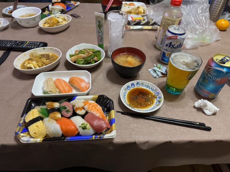 昼食?後に神さんが買物へ行ったので、1階中央の通路のベンチに座って待ってました。少し遅くなったので、寿司を買って来たようです。今回、 盛合せ以外にノドグロのにぎりとサーモンが有りました。