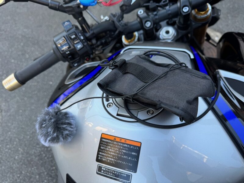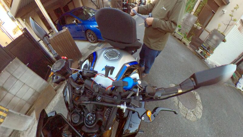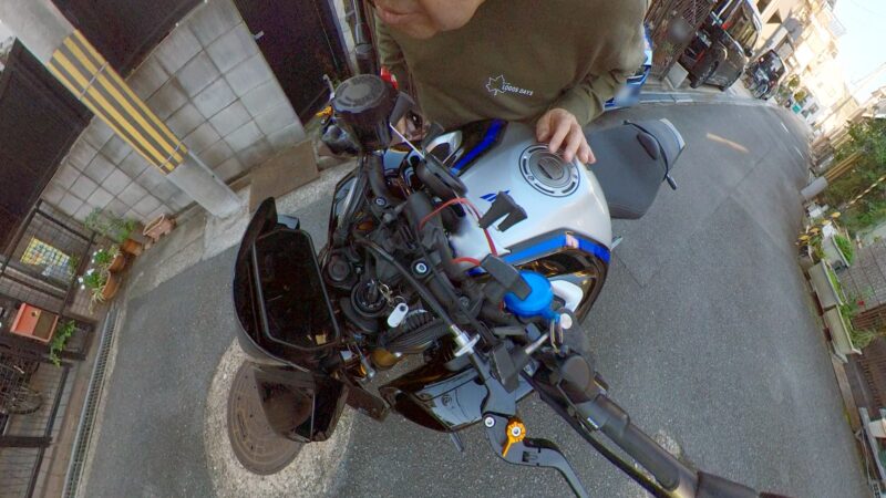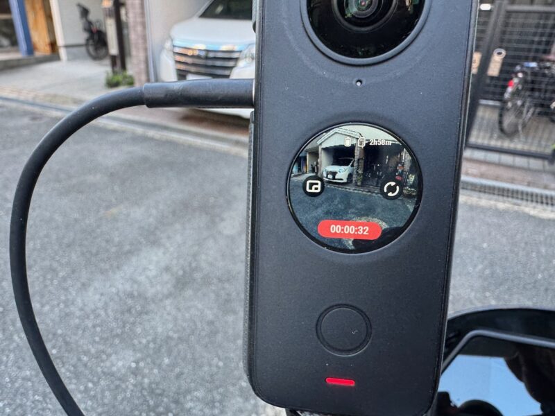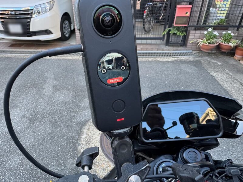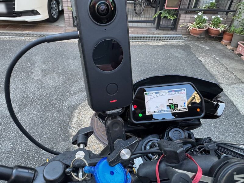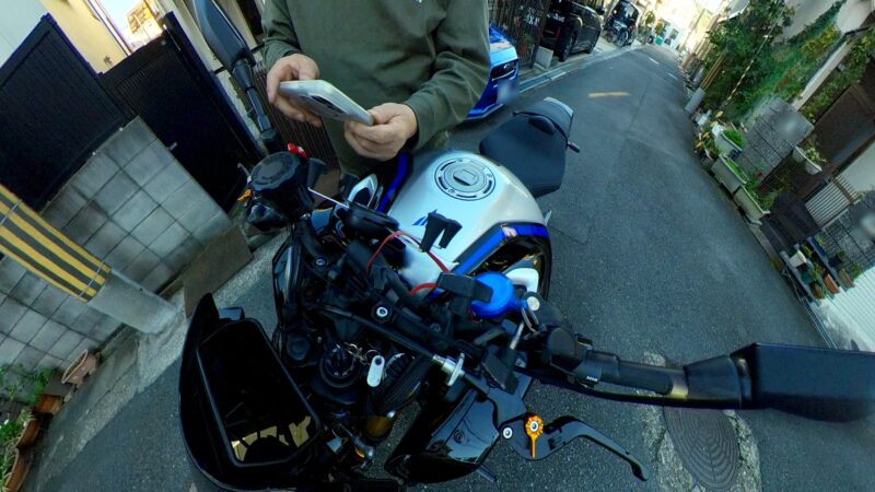 昼食後にゆっくりとして、15時過ぎからバイクの次の走行の為の準備を始めました。先ずは、カメラ(Insta360 ONE X2)の設置です。マイクアダブターなどを入れてるポーチをハンドルの下に設置しました。次は、カメラの設置です。1ステップは、バッテリーの通電です。赤いランプが点いてOKです。カメラも動かしてます。写真を撮影する姿も撮れてます。2ステップは、モフモフを付けたマイクの確認です。声の録音が出来てました。そして、シートの下の車検証のコピーを出しました。自宅に戻って、新しい車検証のコピーを黒い袋に入れてシートの下に入れました。