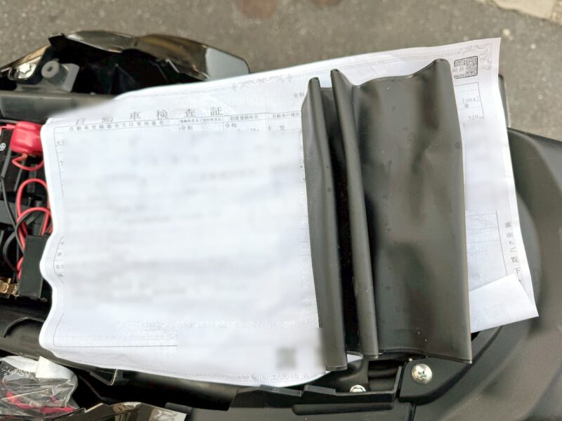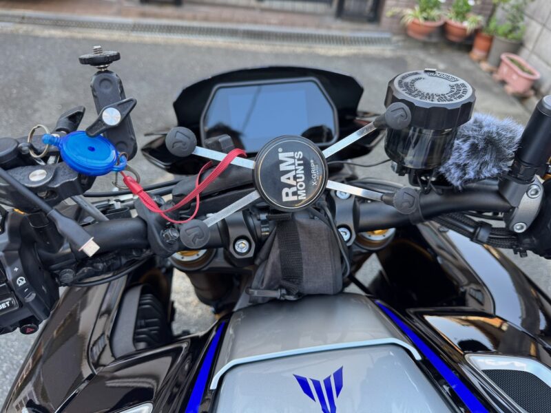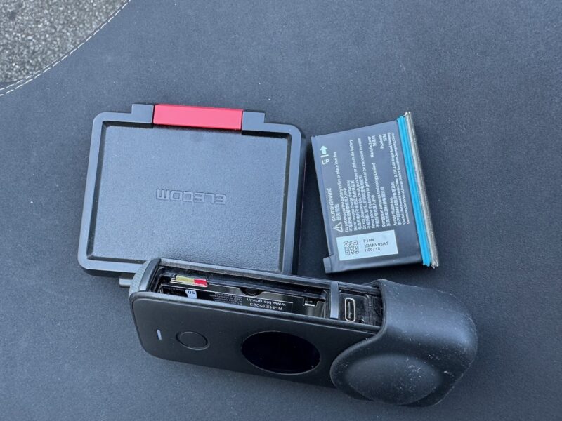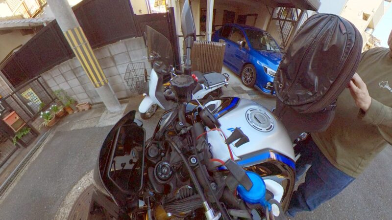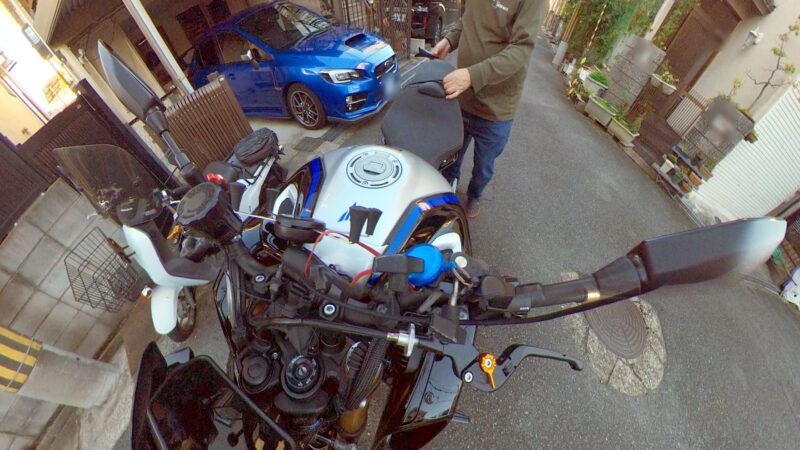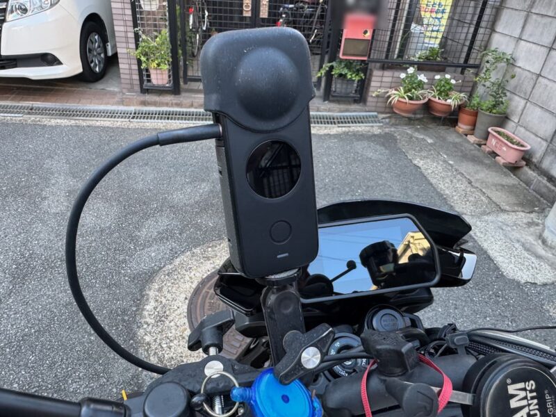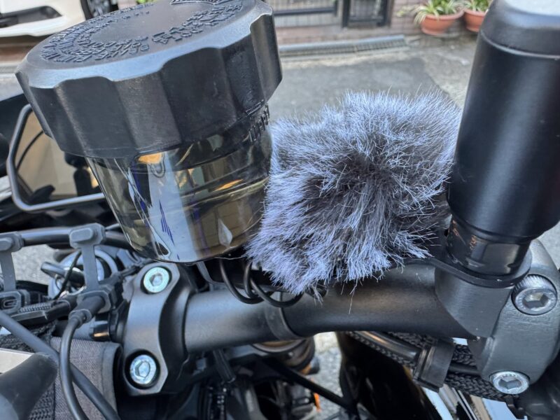 昼食後にゆっくりとして、15時過ぎからバイクの次の走行の為の準備を始めました。先ずは、カメラ(Insta360 ONE X2)の設置です。マイクアダブターなどを入れてるポーチをハンドルの下に設置しました。次は、カメラの設置です。1ステップは、バッテリーの通電です。赤いランプが点いてOKです。カメラも動かしてます。写真を撮影する姿も撮れてます。2ステップは、モフモフを付けたマイクの確認です。声の録音が出来てました。そして、シートの下の車検証のコピーを出しました。自宅に戻って、新しい車検証のコピーを黒い袋に入れてシートの下に入れました。