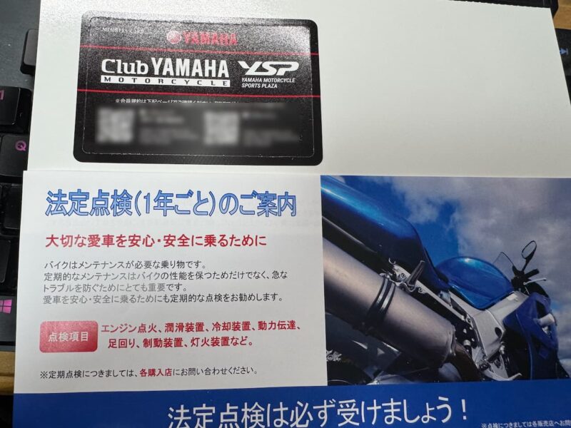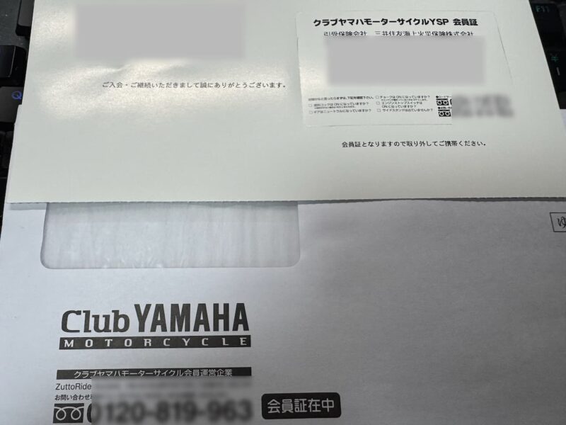 YSP寝屋川で初めて処理をして貰った、Club YAMAHA の新しい会員証が届きました。これで、ロードサービスも大丈夫です。