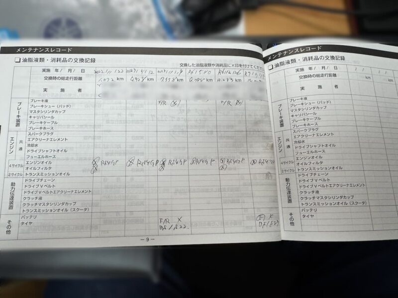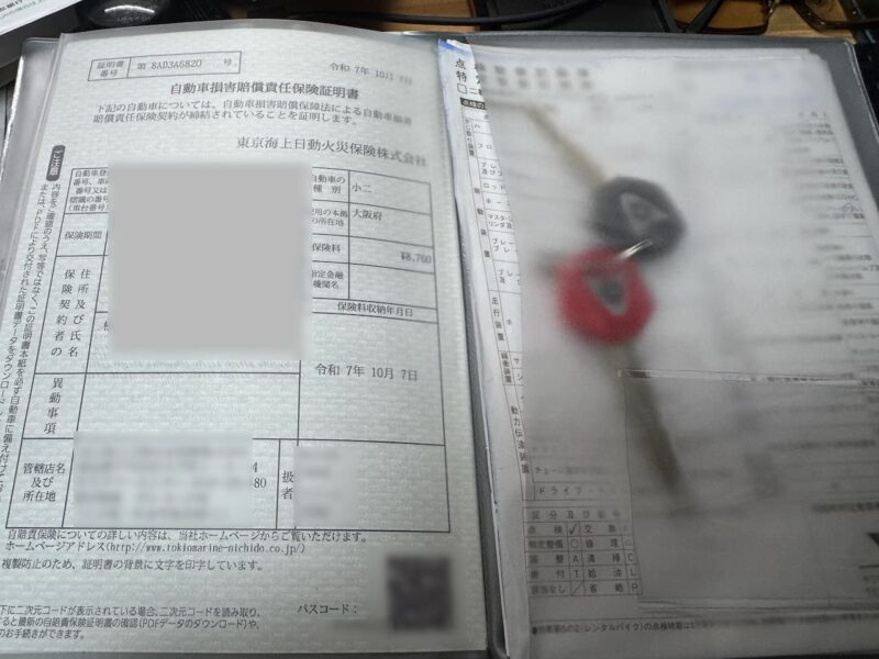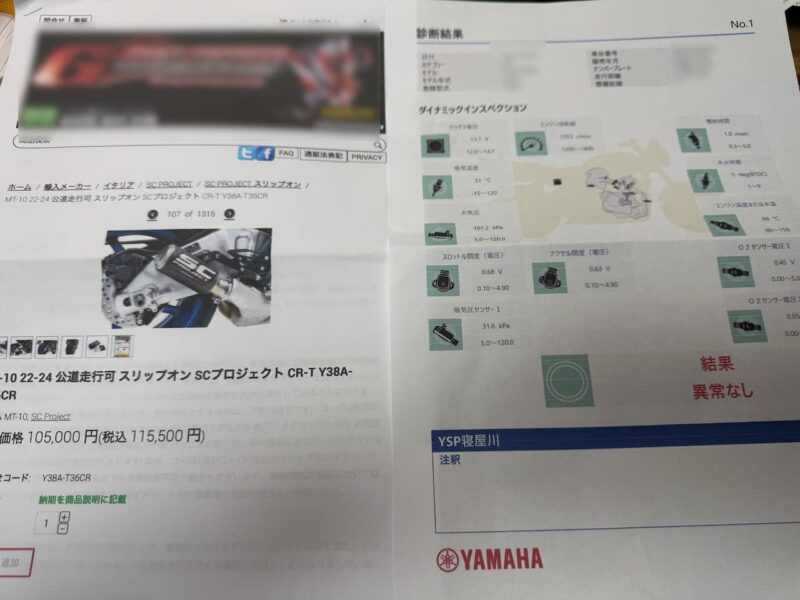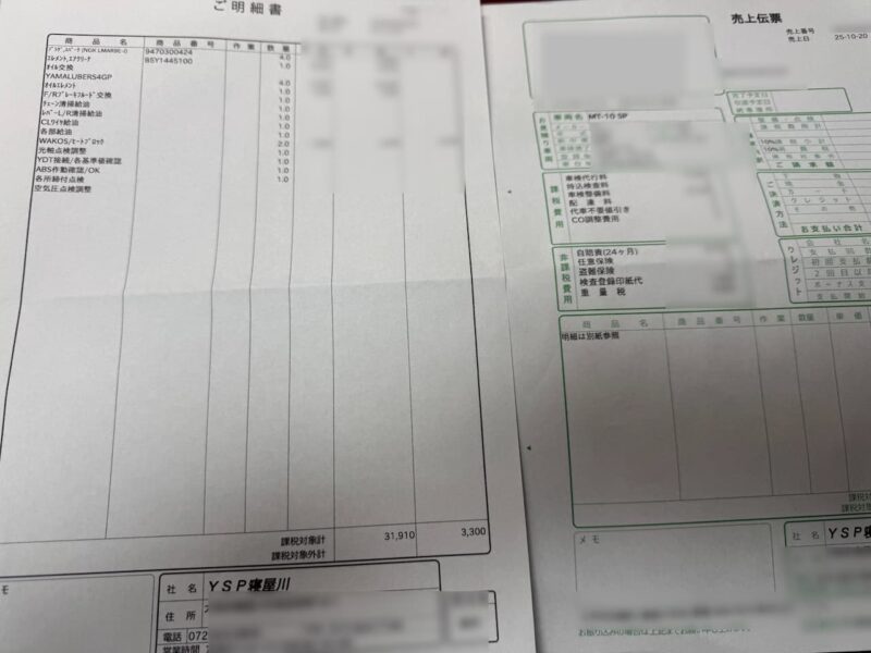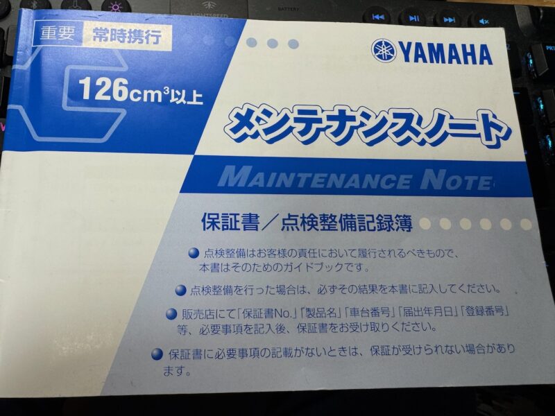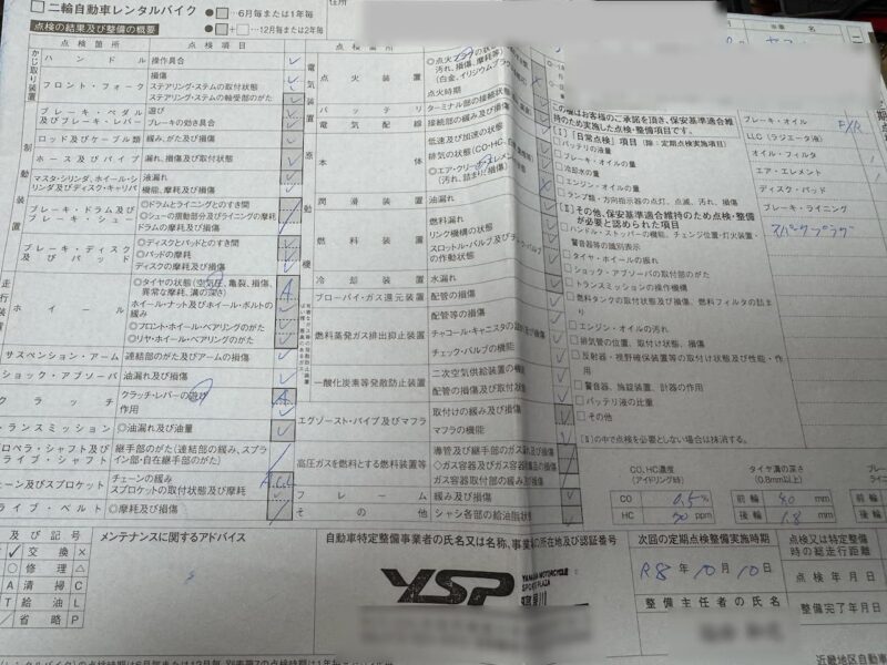 色々と車検時の書類を頂きました。今回は、カスタマイズ無しです。今回、マフラーをSCプロジェクトのままで、お願いしました。商品説明には車検対応と記述がありましたが!?W田さんからは、今回は通過出来たけで、検査員によっては、不合格になるかも分かりませんと言われました。現在は、電子機器の塊のバイクです。検査は、専用の電子機器で行う様です。自賠責の保険書も入ってました。あっ、メンテナンスノートの記述をお願いするのを忘れました。ショップ側は、PCで管理されてるので必要ないのだと思いますが、個人的にはこれがあると目安になるので、助かります。次回、リヤタイヤ交換時に記述して貰おうと思います。