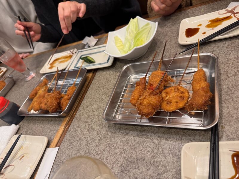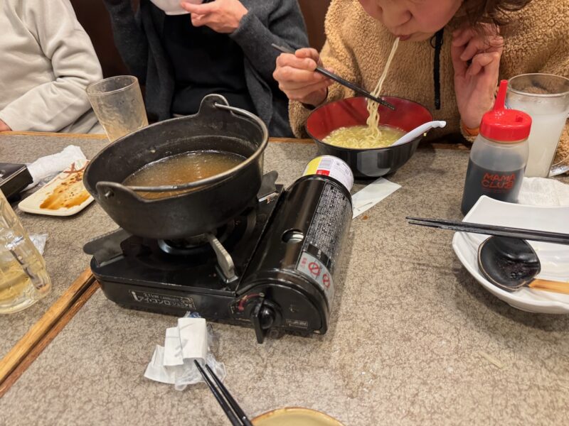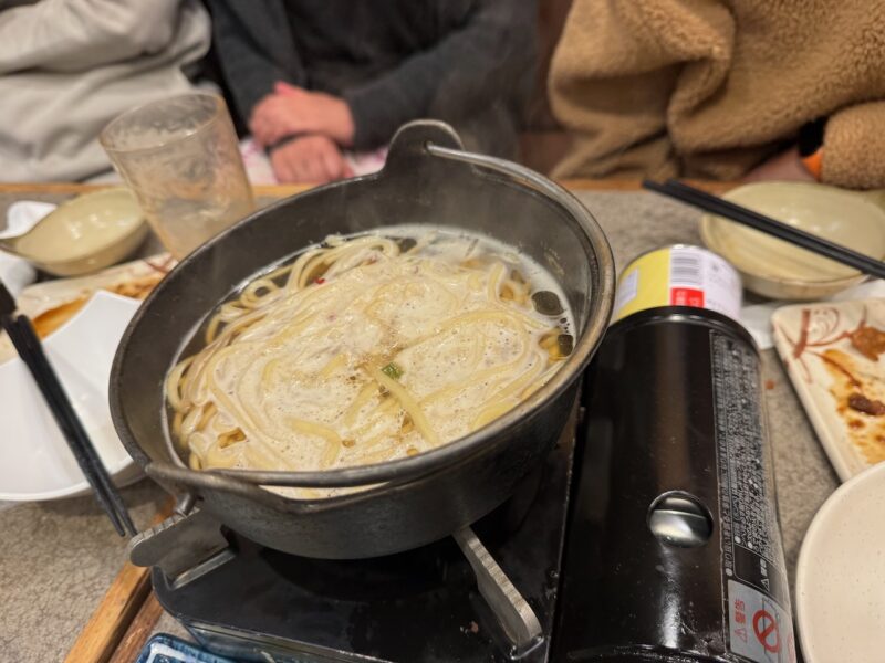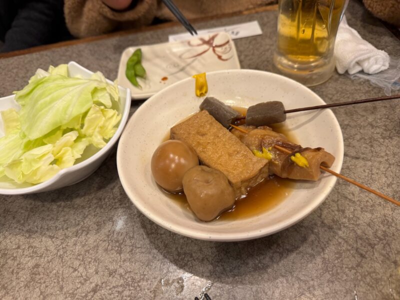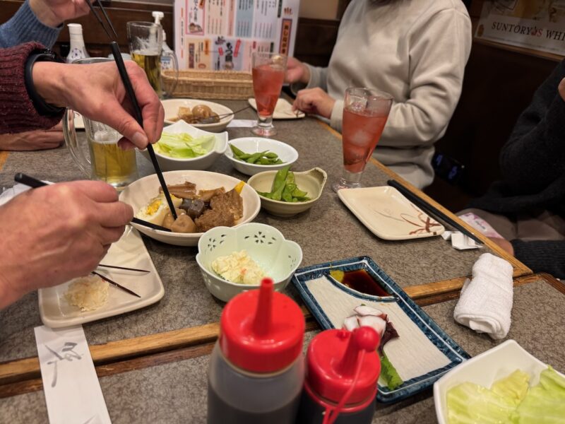 継続的に続いているご近所さんの飲み会です。3組の夫婦で行ってます。近所の居酒屋等を制覇するまで終わらないかも分かりません。今回は、串かつ「みぶ家」です。実は、このお店の3階に東京赴任から戻って1年半ぐらい住んでました。少し、懐かしいです。行ったのは、先週の土曜日(2026年2月7日)です。お店は、大混雑でした。予約で満杯で、臨時のアルバイトも数人居て、ビックリしました。今までで、行った中では、最高にお客様が居ました。でも、飲み物、料理の遅れも無く、素晴らしい運用でした。ビールを飲んで始まり、おでんを頼んで一品物を追加して、串焼きセット、卵焼き、しめ鯖なども食べました。最後にもつ鍋を食べました。飲み物は、バーボンハイボール、いも焼酎のお湯割りなどを飲みました。最後に締めのラーメンです。私は鍋に入れて食べました。他のメンバーは、このお店の名物のインスタントラーメンを食べました。しっかりと卵などの具も入れてくれます。18時から20時半過ぎまで居て、楽しい宴会でした。