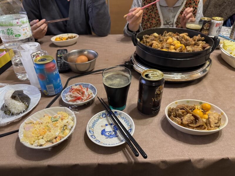 神(;妻)さんと結婚して、ずっと大晦日の晩飯は、地鶏のすき焼きです。最近はひね鳥だと思いますが・・・。地鶏売り場が無くなってきてます。でも、旨いので問題ありません。地元(交野市私部?)の習慣の様です。よく考えると38年間も食べてますね。良い習慣だと思います。そして、最後は、年越し蕎麦です。私は、天ぷらを選びました。23時過ぎに食べました。当然、その前は、少しソファで寝てました。
