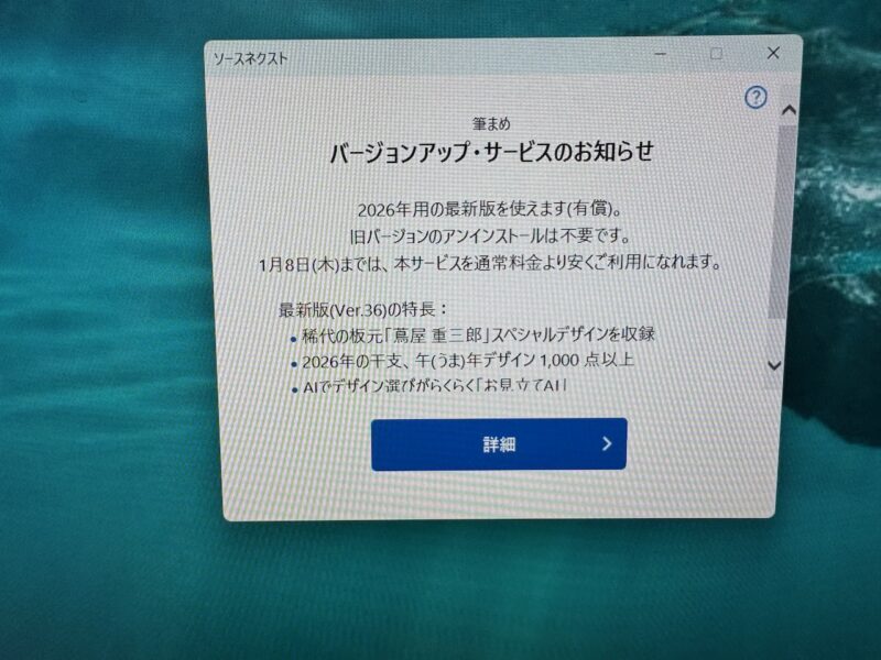 年賀状は、Windows PC のアプリの筆まめを使用して作成してます。年賀状以外にWindows PC を使用する事が少なくなって来てます。以前、古いVTRのDVD化を考えていたのですが、熱が冷めた感じで途中で放棄してしまってます。その関係で、Windows PCを稼働させるのは、半年振りかも分かりません。久し振りなので、電源オン後の操作に凄く違和感を感じました。キーボードの操作もMacと違う為に間違えました。高齢化と使用してない不慣れを手伝って、Windowsに四苦八苦しました。そして、筆まめを操作しようとすると最新版の案内が自動的に案内されます。現在使用は、Ver.31 で最新版は。Ver.36です。