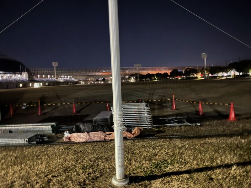 今回も出発が遅くなりました。夕日の日差しでオレンジ色が映えます。上空は、青空です。16:45 に入場しました。18:40 に退場です。駐輪場には自転車が沢山有りました。グランドは、少年サーカーの準備をしてる様でした。まだ、ナイターの照明は点いてません。