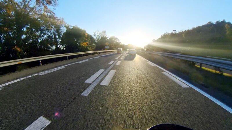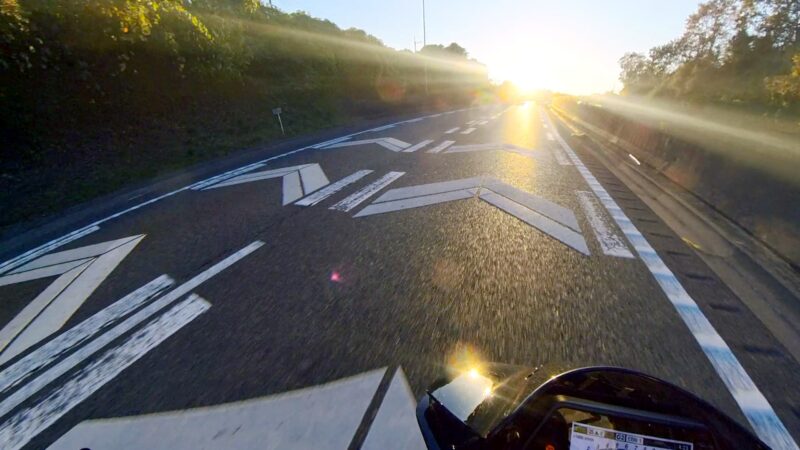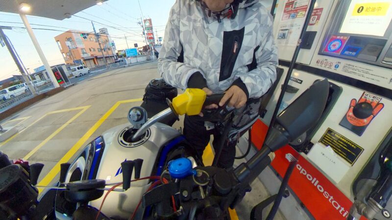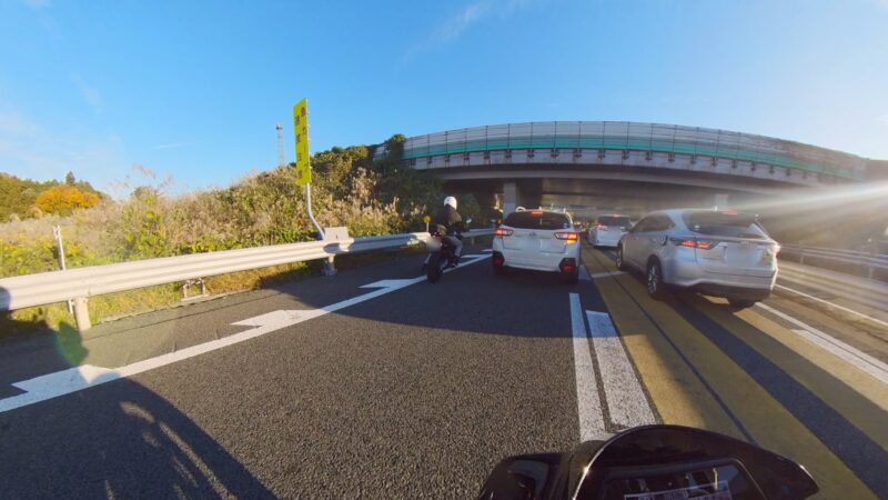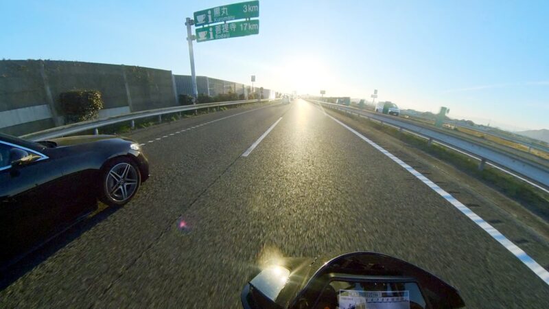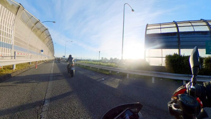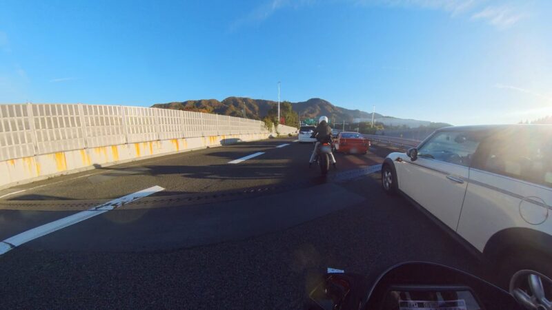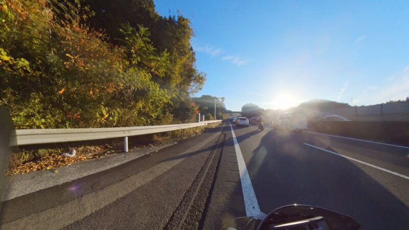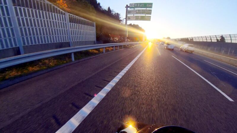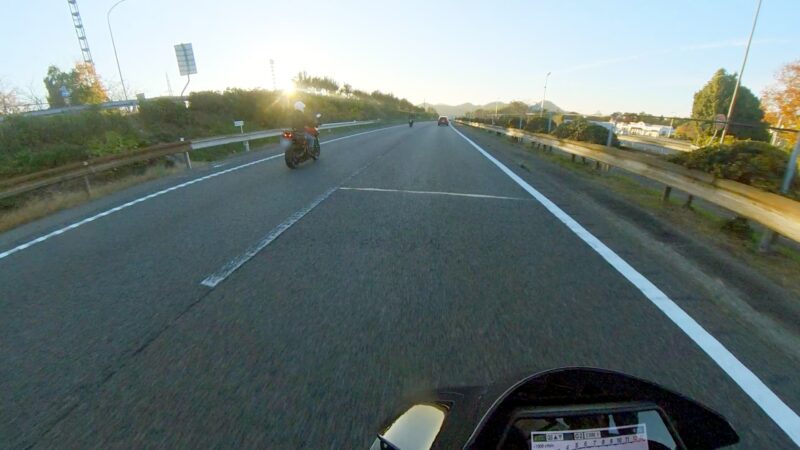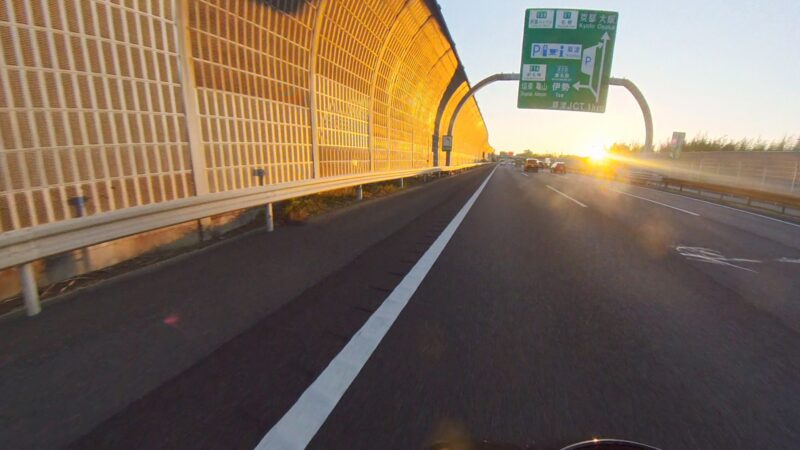 皆さん、バイクに乗ったり、横に立ったりして、W田店長のGOを待ってます。予定を変更して、びわこ食堂本店の近くの大きなGS(ガソリンスタンド)へ行く事になりました。このGSは、本店を出る時に確認してました。その為、珍しく、1番にスタートを切りました。普段は、道が分からないので・・・。本店の前を通過して、GSに到着しました。給油してるとW田店長が到着しました。GSは、広いので、皆さん、色々な場所で停車してました。テルちゃん、ヒデさん達のトレーサー900GTは、給油なしの様です。流石、19ℓのタンクは違うなぁと思いました。GSを出て直ぐに体勢を整える為に停止しました。体制を維持しながらR37を左折しました。その後、北陸道の小谷城ICから高速へ入場しました。ETC専用のICだったので、1台づつの入場です。高速に入って直ぐにグループに追い付きました。名神の分岐付近で混雑し出しました。京都方面は、動いてませんでした。そして、両車線が混み出しました。中央を走る東京走り?で前進します。でも、狭くなってる所で外の路側方へ車線を変更しました。登坂車線は、ガラガラで走行しました。前のMT-09SPさんは、中央へ戻りましたが、私は、路肩側の白線のオンライン走行を続けました。少し走ると中央からW田店長が飛び出して来ました。左車線が走行を規制されてました。そこにポツンと黄色のスズキVストロームが停車してました。声を掛けた方が良いか?迷いましたが、此方を見てなかったので、困ってるか?様子が分からなかったのでスルーしました。その後、車線が1車線になりました。但し、ポールが若干車線より外側に置かれていたので、トンネルを含めて、すり抜けしやすかったです。そして、規制が解除になりました。いきなり空きました。その後も快走を続けました。オートクルーズを利用しながら、楽に走行しました。但し、逆光になり、眩しかったです。サイドカー付きのハーレーを見ました。追越し車線を前の車に付いて走行してるとヒデさんとテルちゃんのトレーサー組に走行車線から抜かれました。一瞬、追い掛けようかと思いましたが、少し疲れが出てたので、止めて、高速巡行で行きました。混んだりして、走行車線からの追い抜きもしました。混むと追越し車線へ移動です。一時的に渋滞したりしましたが、ほぼ走行車線を利用しながら順調に移動しました。夕日が眩しいです。草津JCTでは、昔、名神から草津PAに入れずに通過した事が有ります。看板をしっかり見ながら見ながら丁寧に走行しました。そして、無事に草津PAに到着しました。いつも停車してるゼブラゾーンに停車しました。飛ばし屋のヒデさんとテルちゃんは、到着してました。夕日が本当に眩しいです。16時半過ぎの到着です。