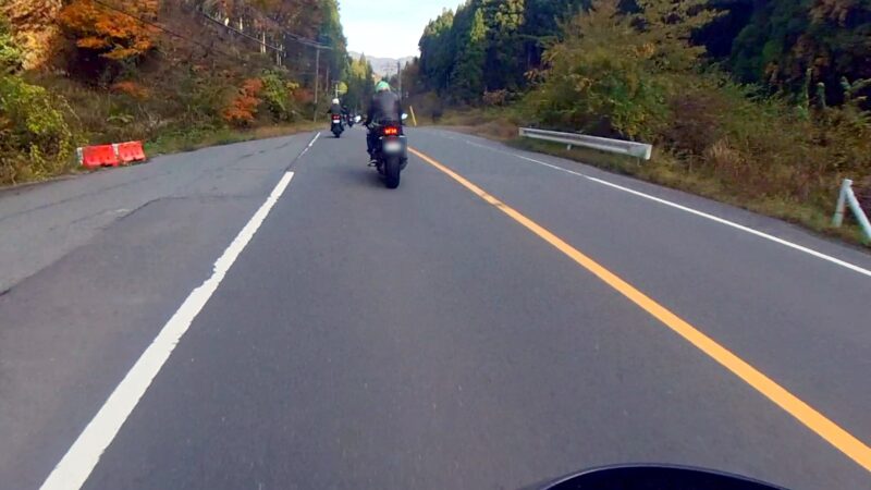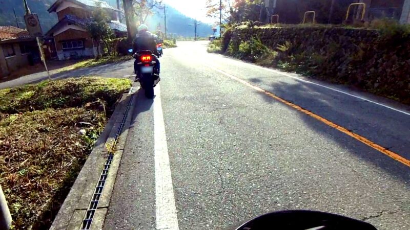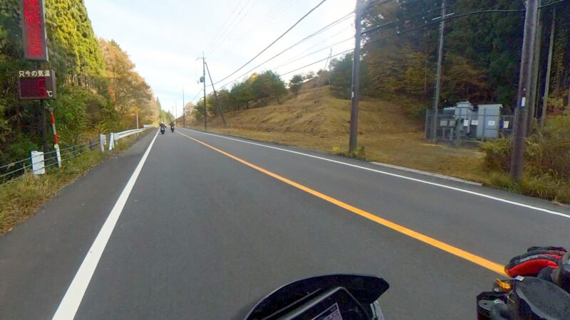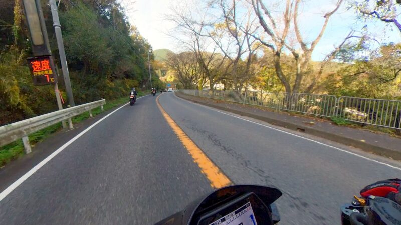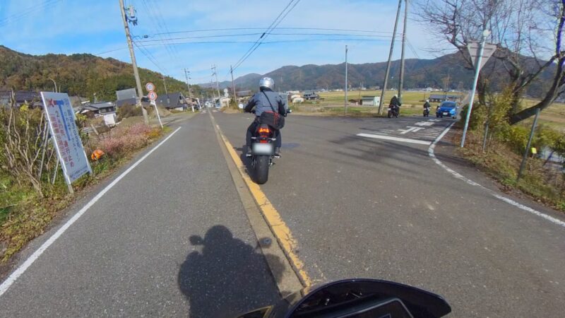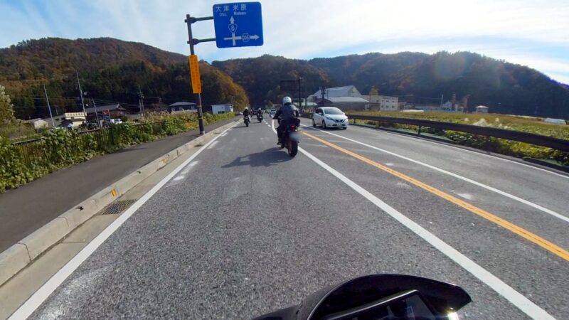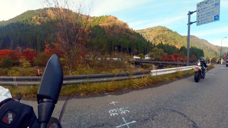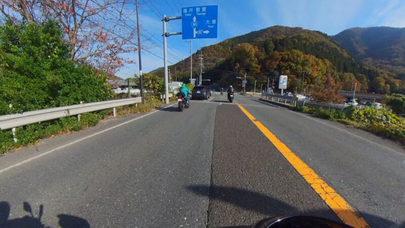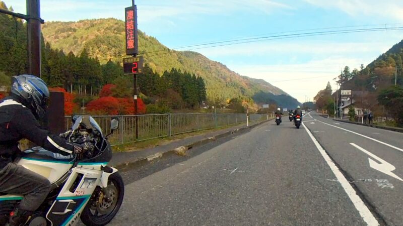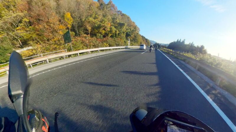 ほぼ7時半の定刻に出発出来ました。総勢、19台の大所帯です。さっ、どうなるのでしょうか?名神を走行して、京都東I Cから出ました。IC手前でFZフェザーさんが停車してました。ETCカード?でも忘れたのでしょうか?それとも現金の準備でしょうか?故障等では、無い様なので皆さんスルーしてました。その後、料金所を抜けて、R161へ出る道が渋滞です。19台の大所帯なのですり抜けなどは、行いません。整列して、走行します。R161に入るとまだ、渋滞は発生してない様でした。軽快に改装します。琵琶湖や山の麓は、霞んでました。そして、真野ICで降りました。降りる前に一時停車して隊列を確認します。船頭のW田店長の配慮です。その後、左折して、R477、R367を走行します。気温が7℃を表示してました。道は空いていて、バイクとしては、快走出来ました。トンネルを抜けたり、紅葉を見たりで素晴らしい景色でした。気温が2℃や1℃を表示してました。でも、余り寒さを感じませんでした。でも、凍結注意と表示されると少し心配になります。そして、程なく、道の駅;くつき新本陣に入場です。手前のバイクの駐車場ではなく、奥の車の停車スペースに停車しました。W田店長にバイクの移動を手伝って貰いました。もう介護老人の様です。でも、疲れが少なくなるので、助かります。他の高齢者の方も支援を受けてました。本当にご苦労様です、助かりました。そして、どうして、軽々とバイクを移動できるのか?不思議です。8:45に道の駅;くつき新本陣に到着です。