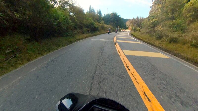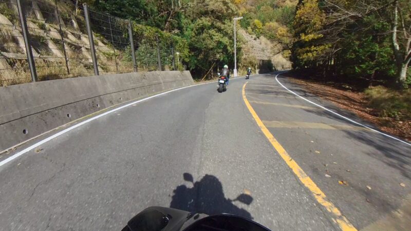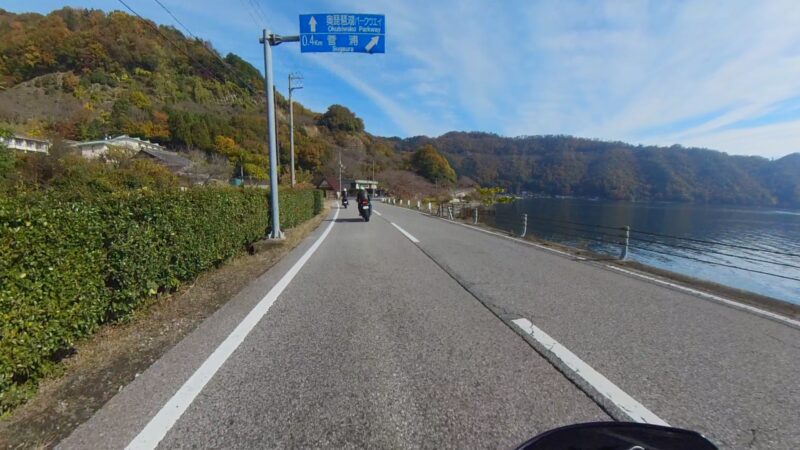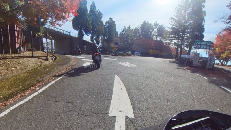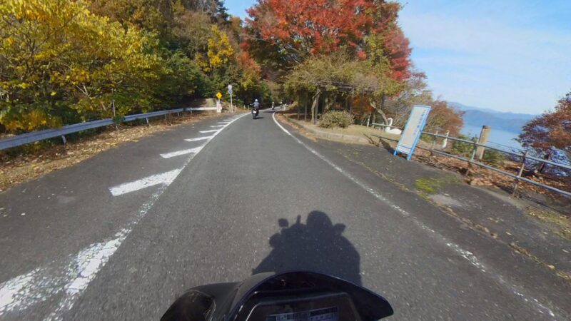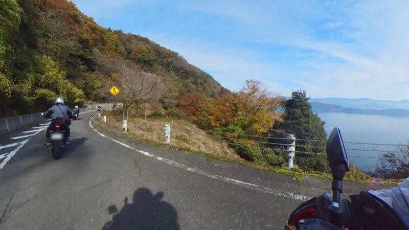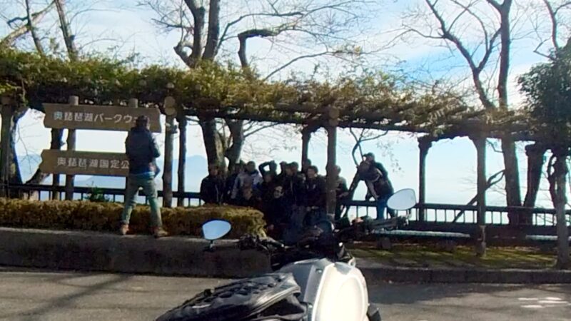 当初計画では、メタセコイア並木を抜ける予定でしたが、交通規制があり、無理でした。マキノピックランドの駐輪場を右に出ました。スーさんが皆さんが出て行く所の写真を撮ってました。出て、直ぐにW田店長が整列状態を確認しました。ハーレー軍団の後に付きました。そして、ハーレー軍団は、左に我々は、右へ曲がりました。何とか続いてるようでした。R161に出ました。その後、R557から琵琶湖沿いの道を走行しました。トンネルが有ったり、片側規制の信号機が有ったりしましたが、軒並み快走でした。奥琵琶湖パークウェイに入りました。峠道です、少し嬉しくなりました。そして、あっと言う間につづら尾崎展望台に11時過ぎに到着しました。