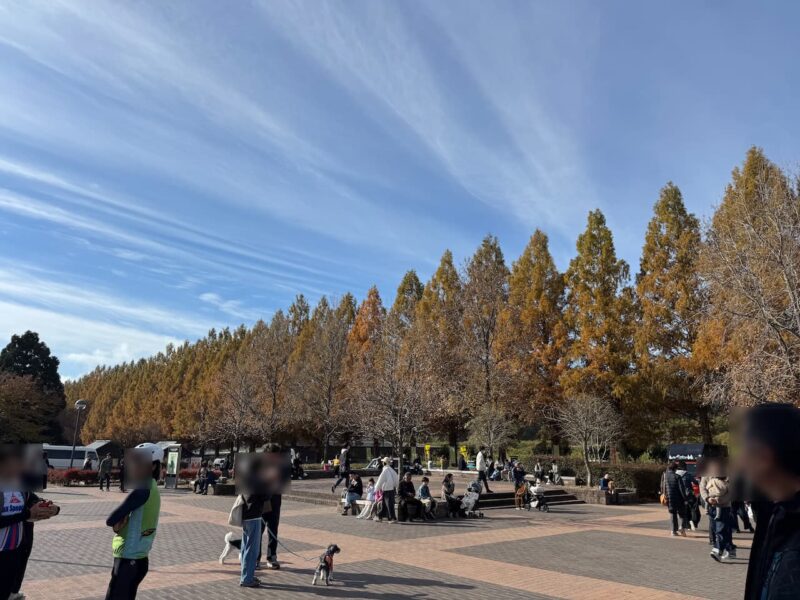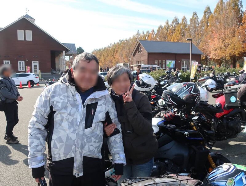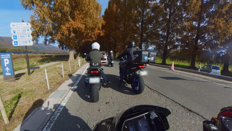 建物の中に入ってトイレを使用しました。その後、メタセコイア並木を遠目で見学しました。バイクの駐輪場でもメタセコイア並木を見ました。するとまたまた、スーさん登場です。単独なので、裏道などを走行して、早く来たのだと思います。ヒデさん・テルちゃん夫妻、タケちゃんの写真と私とテルちゃんの写真を撮ってくれました。ありがとうございました。