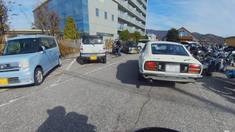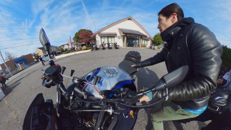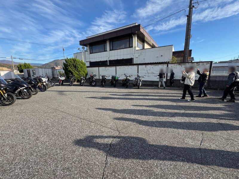びわこ食堂本店の駐車場から移動します。駐車場から出す時にTさん(XJR)に後から引っ張って貰いました。そして、第二びわこ食堂駐車場へ移動しました。まだ、歩いて移動中の方が沢山居られました。自分だけバイク移動、申し訳無かったです。そして、駐車場に到着しました。FZやXJRなどの旧車も混じってます。此処でW田店長から、当初計画の近江八幡散策を中止して、戻るお話が有りました。このまま行ったら、真っ暗の探索に・・・。時間ができたので、此処にバイクを並べて、写真撮影をする事になりました。先ずは、バイクだけ、その後、バイクの横に立っての撮影を行いました。第二びわこ食堂の閉店は、勿体無いと思います。でも、人手も不足してるのかも分かりません。